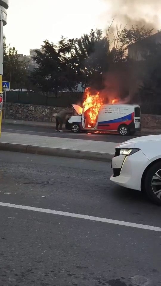 İstanbul Kağıthane’de saat 08.00 sıralarında Cendere Caddesi üzerinde hareket halindeki hafif ticari araçtan dumanlar yükselmeye başladı. Motor bölümünde başladığı belirtilen yangın kısa sürede aracı sardı.