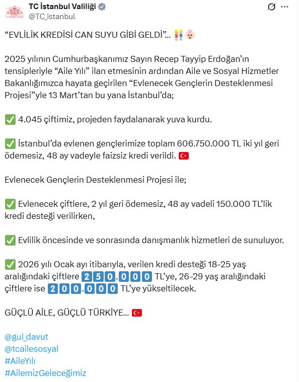 İstanbul Valiliği, “Aile Yılı” kapsamında yürütülen “Evlenecek Gençlerin Desteklenmesi Projesi” kapsamında başarılı sonuçlar elde etti. Proje kapsamında İstanbul’a yerleşen 4 bin 45 genç çift, toplamda 606 milyon 750 bin lira tutarında faizsiz konut kredisi almaya hak kazandı.