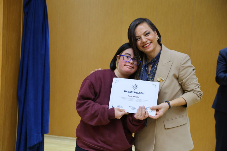 “Sürdürülebilir Tasarım Atölyesi” eğitim programına 6 ay boyunca devam eden özel gereksinimli bireylere sertifikaları Başkan Kınay, Hasan Özkoparan, Nurcan Pirgan Çakır ve Uğur Durmaz tarafından takdim edildi.